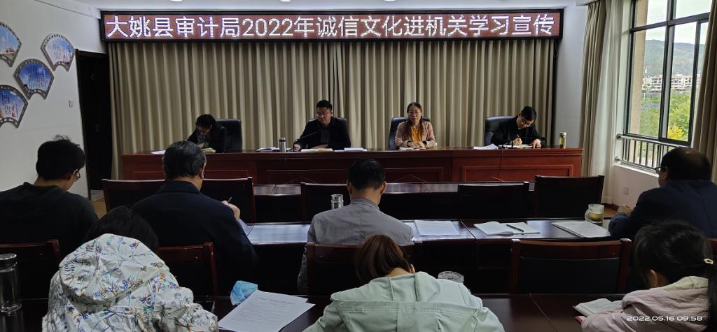 为加强理想信念教育,弘扬和践行社会主义核心价值观,传承优秀的传统文化,弘扬伟大的民族精神,推动文化建设,提高全局干部职工的文化素养,建设充满生机和活力氛围,2022年5月16日,大姚县审计局开展诚信文化进机关宣传活动。活动以“诚实守信”为主题,通过积极弘扬中华民族传统美德,推动审计机关诚信建设,引导审计干部自觉遵守审计职业道德,增强诚信意识,深化对“重诚信、守承诺、尽职责”的认同感,在工作和生活中,从自身做起、从身边点滴做起,诚信做人、诚信审计,做到“审计恪守独立客观公正,做人不忘正直诚信为本”,树立起诚实守信的道德榜样。