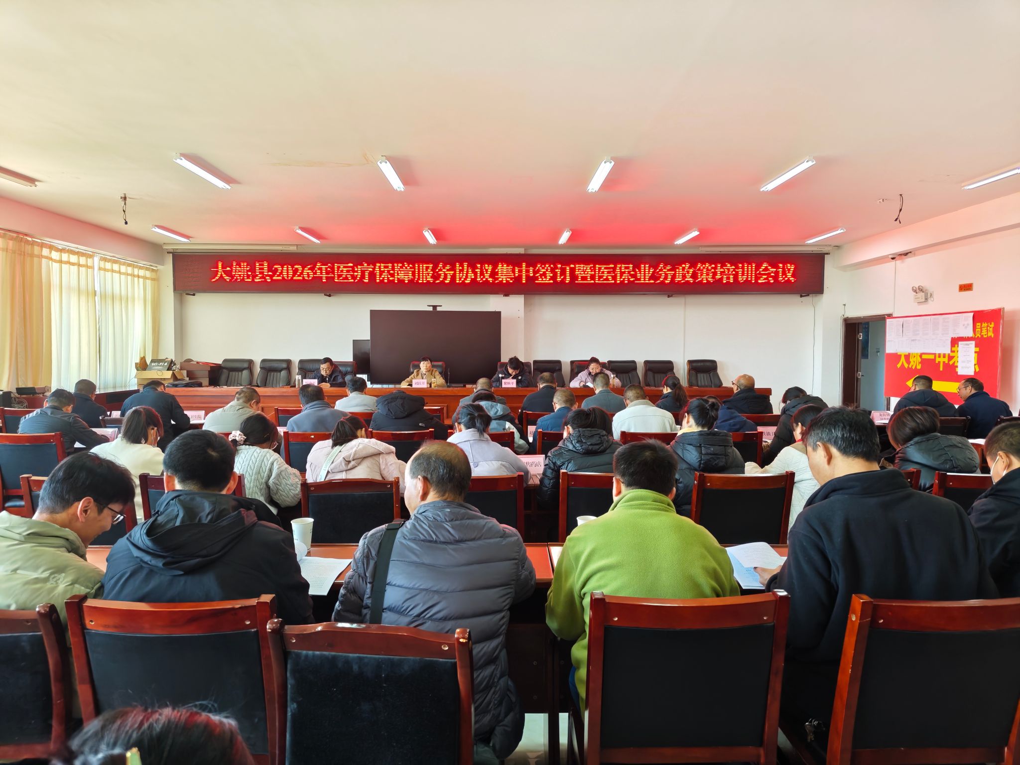 12月29日,大姚县医疗保障局组织召开全县2026年度医疗保障服务协议集中签订暨医保业务政策培训会议,县内定点医药机构负责人、县医保局领导班子、相关股室负责人共计50余人参会。