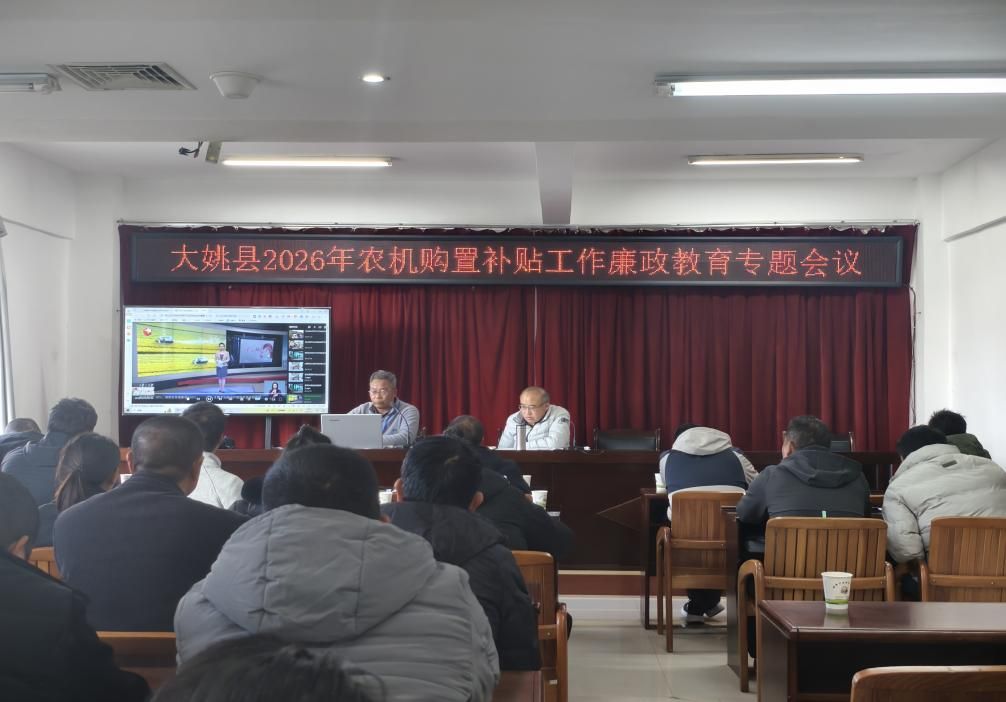 为顺利推进农机购置与应用补贴工作,确保农民切身利益和国家财政资金安全得到保障,2026年1月7日,大姚县农业农村局组织全县农机经销商、农机报废回收拆解企业、乡镇工作人员共一百余人开展集体廉政教育,会议观看了警示教育片、简要通报了楚雄州近年来在农机购置与应用补贴领域发生的腐败案件,开展了集体廉政谈话。