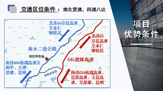 3.交通区位:大姚县已基本建成“两纵一横”高速路网和“四纵四横”干线路网,S45 永金高速、G227 国道以及即将开工建设的大攀高速贯穿全境。北连 G5 京昆高速,南连 G56杭瑞高速、新昆楚大高速,到昆明 1.5 小时车程,到楚雄40 分钟车程,到攀枝花 1.5 小时车程,到大理 1 小时车程。
