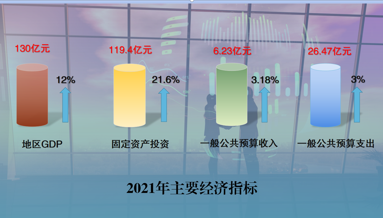 社会经济情况:2021年,全县实现生产总值128亿元,增长13.5%。完成规模以上固定资产投资124亿元,增长25%。财政一般公共预算收入6.2亿元,增长3.2%;财政一般公共预算支出26.5亿元,增长3%。