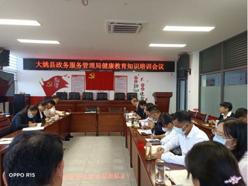 10月8日,大姚县政务服务局举办了健康教育培训班,全局40余名干部职工参加了培训。培训班上,分管领导刀副局长带领大家一起重温了《全民健康生活方式行动(2016-2025)倡议书》《致全县人民的一封健康促进倡议书》,并对健康的含义、有害健康的八种行为、吸烟对人体健康的危害、心理卫生知识等4方面的健康知识进行了专题辅导。