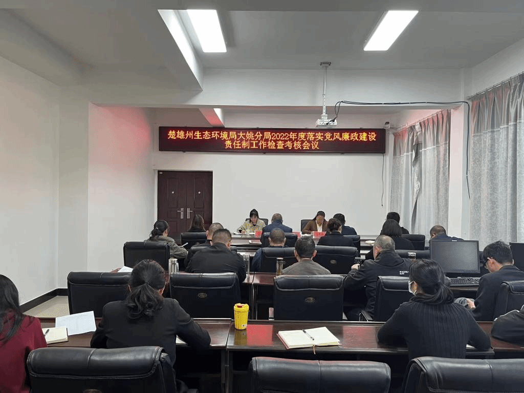 会议由县纪委县监委四级调研员吴光艳同志主持。会上,党组书记、局长钟学能同志汇报了2022年度州生态环境局大姚分局党风廉政建设责任制工作开展情况,并作了个人述责述廉报告。
