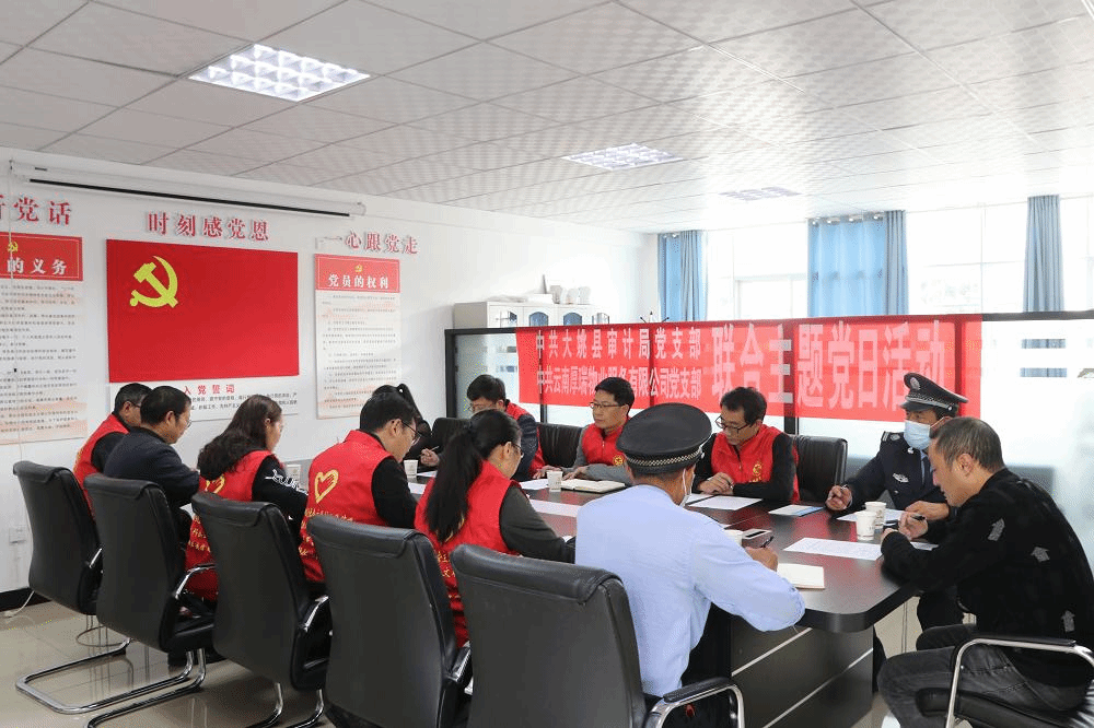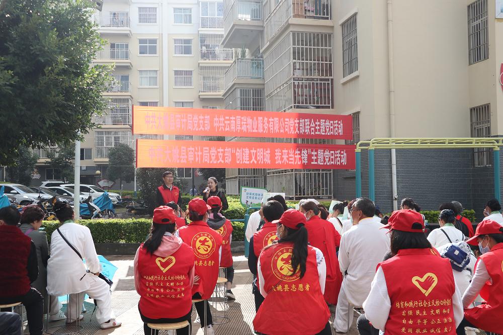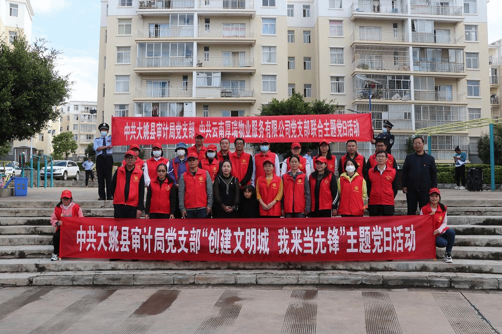 近日,大姚县审计局党支部、云南厚瑞物业服务有限公司党支部联合开展“创建文明城、我来当先锋”主题党日活动,第一时间传达学习党的二十大精神,号召广大党员干部争当文明城市创建的践行者和推动者,为全县创建全国文明城市打牢基础、贡献力量。