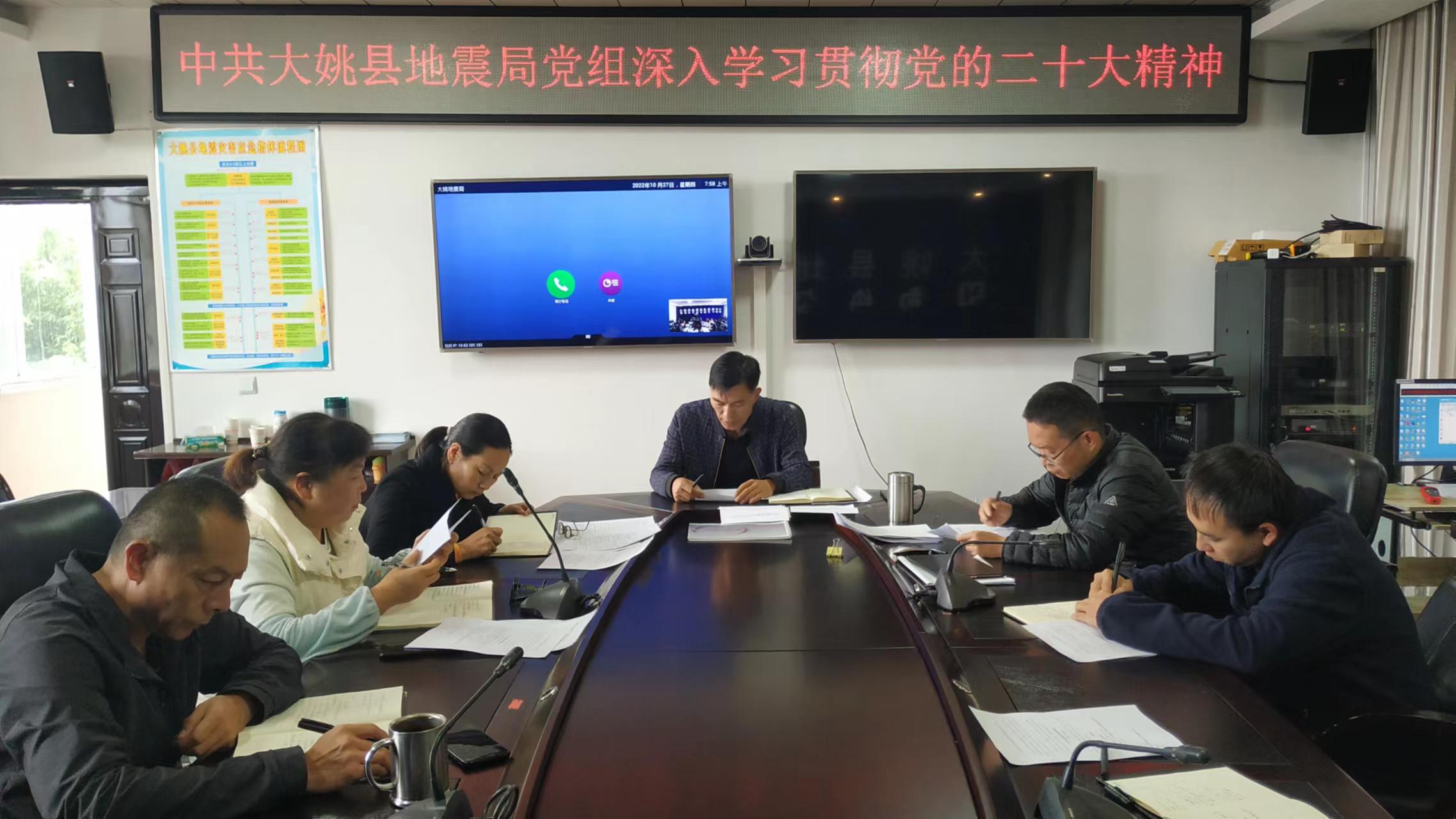 近日,大姚县地震局党组召开党组(扩大)会议,专题学习宣传贯彻党的二十大精神,党组书记、局长余晓红主持会议。