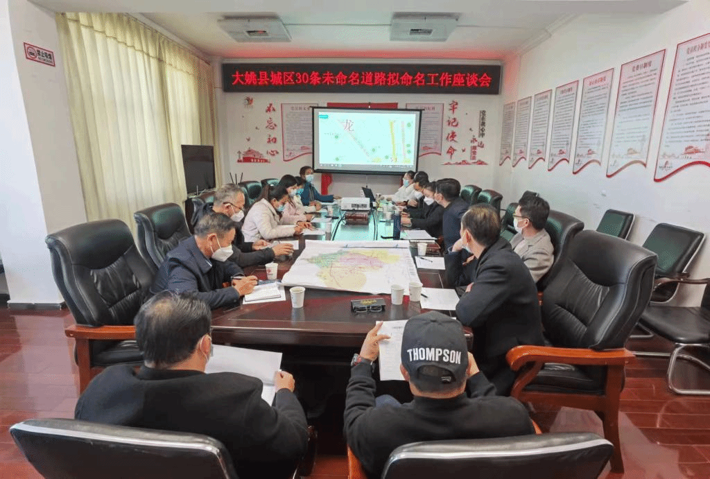 会上大姚县民政局党组书记、局长张如喜同志对拟命名工作进行了说明,地名区划工作人员对大姚县城区30条未命名道路拟命名方案进行演示并具体讲解,重点就新命名、拟更名内容及理由向与会人作了介绍。与会人员本着“通俗易懂、简洁明了、突出文化元素、彰显地域特色”的道路命名原则,结合道路命名规则,对大姚县城区内30条未命名道路进行了拟命名。