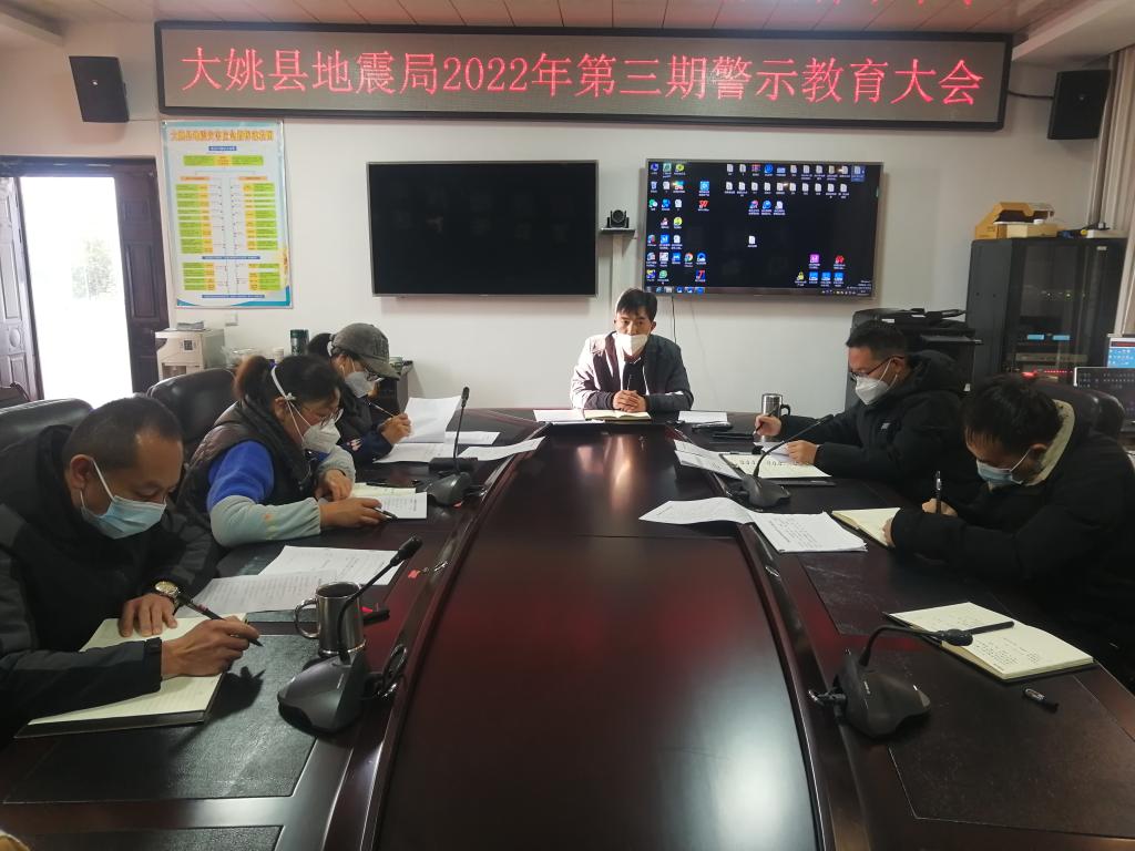 近日,大姚县地震局召开2022年第三期警示教育大会。会上,全局党员、干部职工7人集中观看了《对“酒驾醉驾”坚决说不》《失守的质检“守门人”》警示教育片。