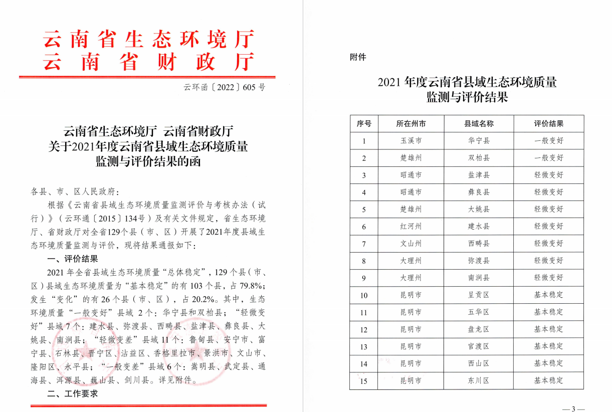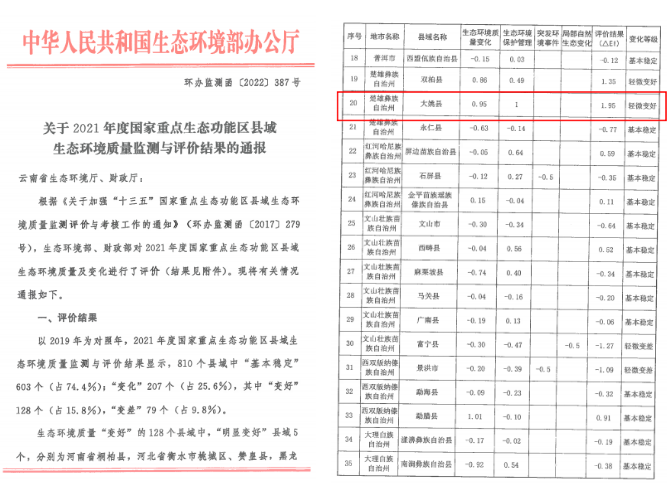 近期,国家生态环境部公布2021年度国家重点生态功能区域生态环境质量监测评价与考核结果,大姚县荣获“轻微变好”,为全国参加考核的810个县域中被评价为“轻微变好”的94个县域之一。云南省生态环境厅、云南省财政厅也联合公布了2021年云南省县域生态环境质量监测评价与考核结果,大姚县再次荣获“轻微变好”等次,综合排名位居129个考核县(市、区)中的第五名。自2017年起纳入国家重点生态功能区考核以来首次在国家级省级考核中同时获得该等次。
