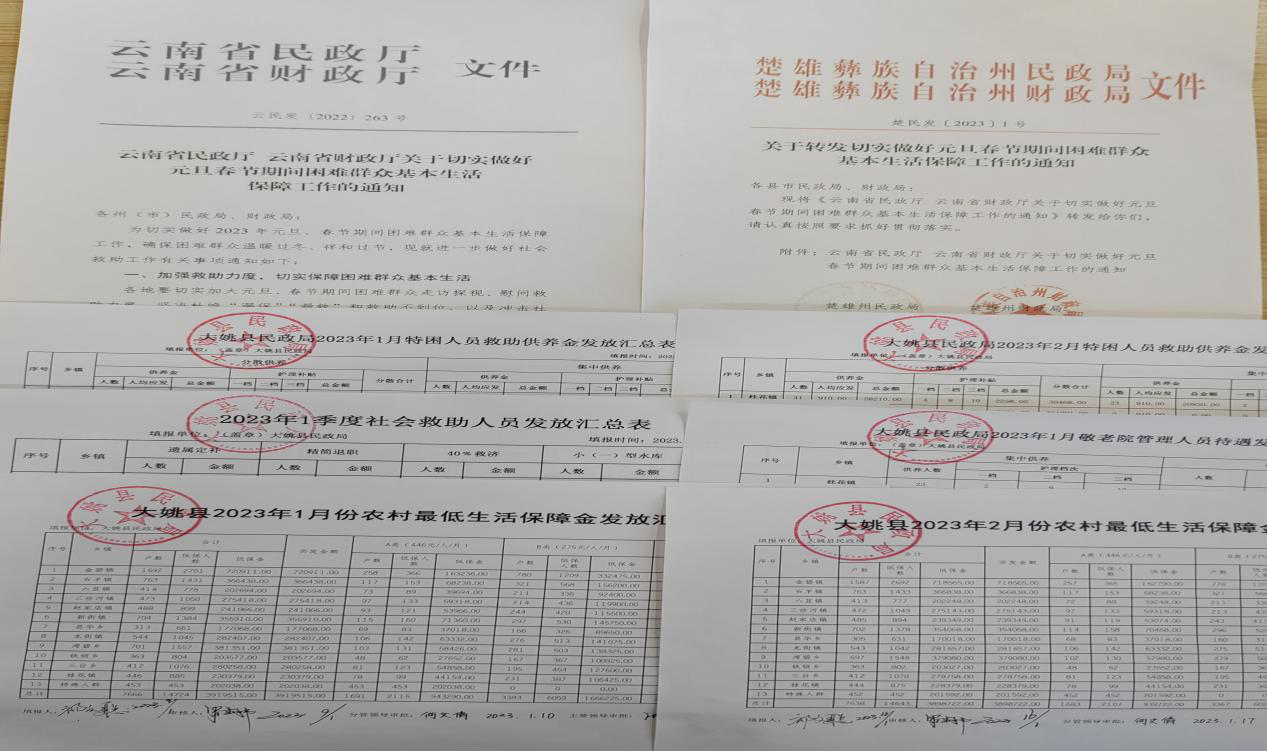 为切实保障两节期间困难群众基本生活,大姚县进一步提高政治站位,强化责任担当,积极行动,按照省州民政和财政部门《关于切实做好元旦春节期间困难群众基本生活保障工作的通知》要求,落实落细困难群众基本生活救助各项政策措施,将符合条件的困难群众全部纳入救助范围,及时足额发放2023年1至2月份各类困难群众救助金。