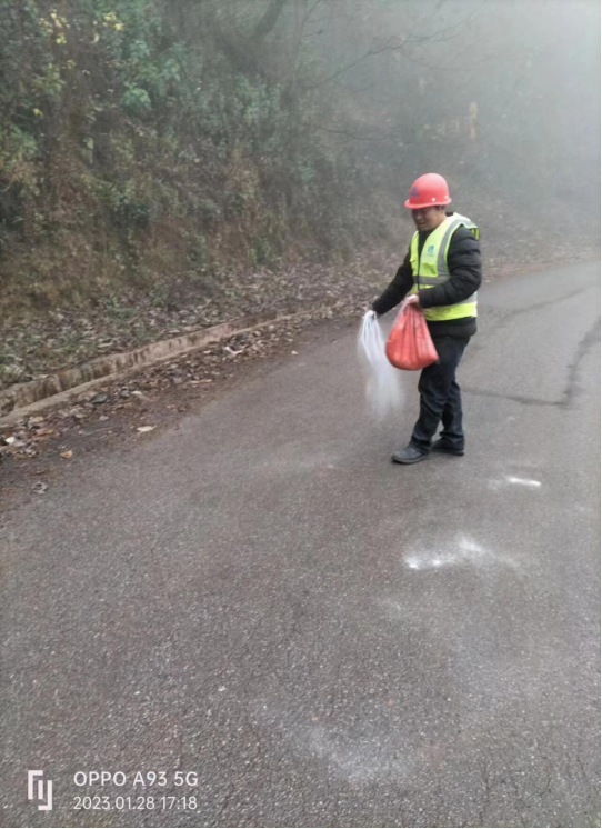 春节收假第一天,大姚县迎来一次强降温天气,造成我县县道部分路段不同程度出现路面结冰现象,给节后返岗人员出行带来极大安全隐患。大姚县地方公路管理段迅速启动道路结冰处置预案,安排公路养护人员对县道公路开展道路结冰安全隐患排查,经排查,县道瓦拉公路昙华乡金山垭口路段及湾碧乡冶基厂路段结冰较为严重,随后,公路养护人员立即开展道路除冰防滑保畅工作。