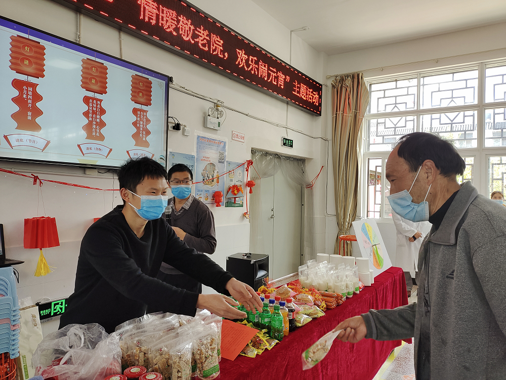 下午3点,餐厅里响起了欢快的音乐,墙上挂着一个个红灯笼,丰富的奖品在领奖区整齐摆放,猜灯谜现场布置得简单而温馨。老人们陆续坐下后,工作人员首先介绍了元宵节的由来,紧接着是举行猜灯谜和转转盘抽奖游戏活动。每位老人有三次猜灯谜机会,猜对的领取灯谜奖品,所有老人都可以玩转转盘抽奖游戏,都能拿到相应礼品。灯谜现场,老人个个喜笑颜开,工作人员忙得快乐而充实。