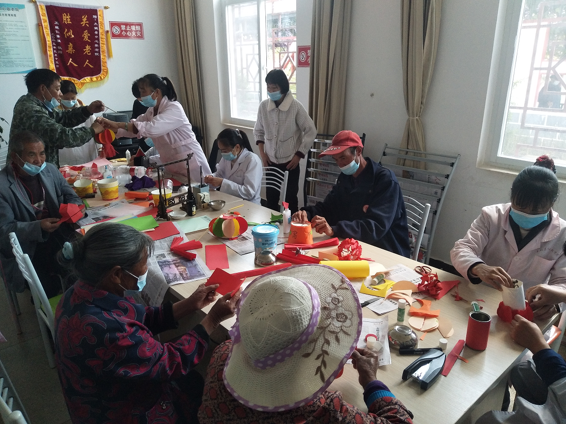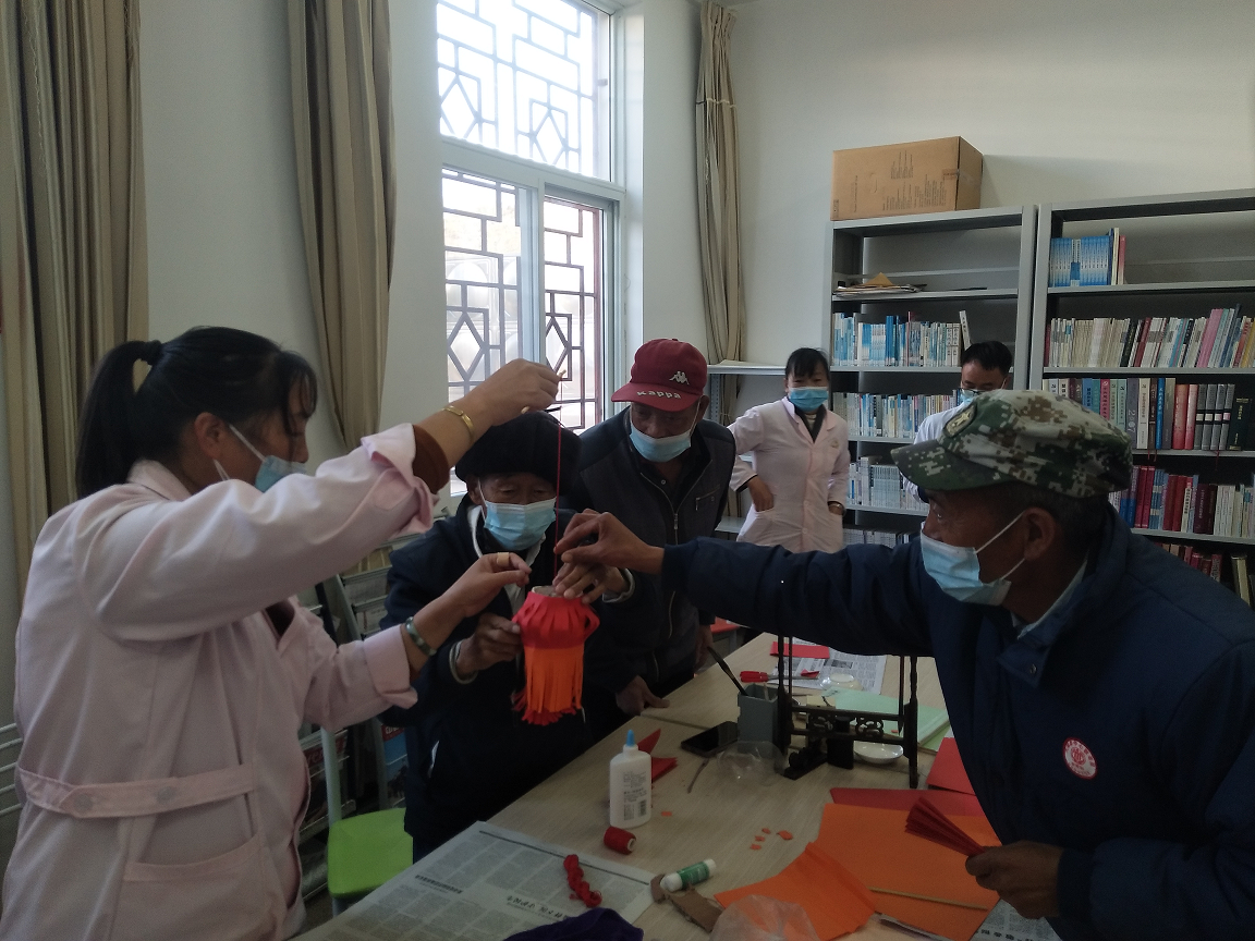 早上10点,在阅览室里,工作人员带领老人快乐有序地制作灯笼、做手工。做灯笼的材料是就地取材和废物利用,饮料瓶、一次性筷子、一次性纸碗等做成灯笼的骨架。有的制作骨架,有的裁纸,有的剪花,有的粘贴;你扶着我贴着,你画着我剪着,你穿针我引线……在大家的积极参与下,不知不觉地,一个个各式各样的灯笼就做好了。