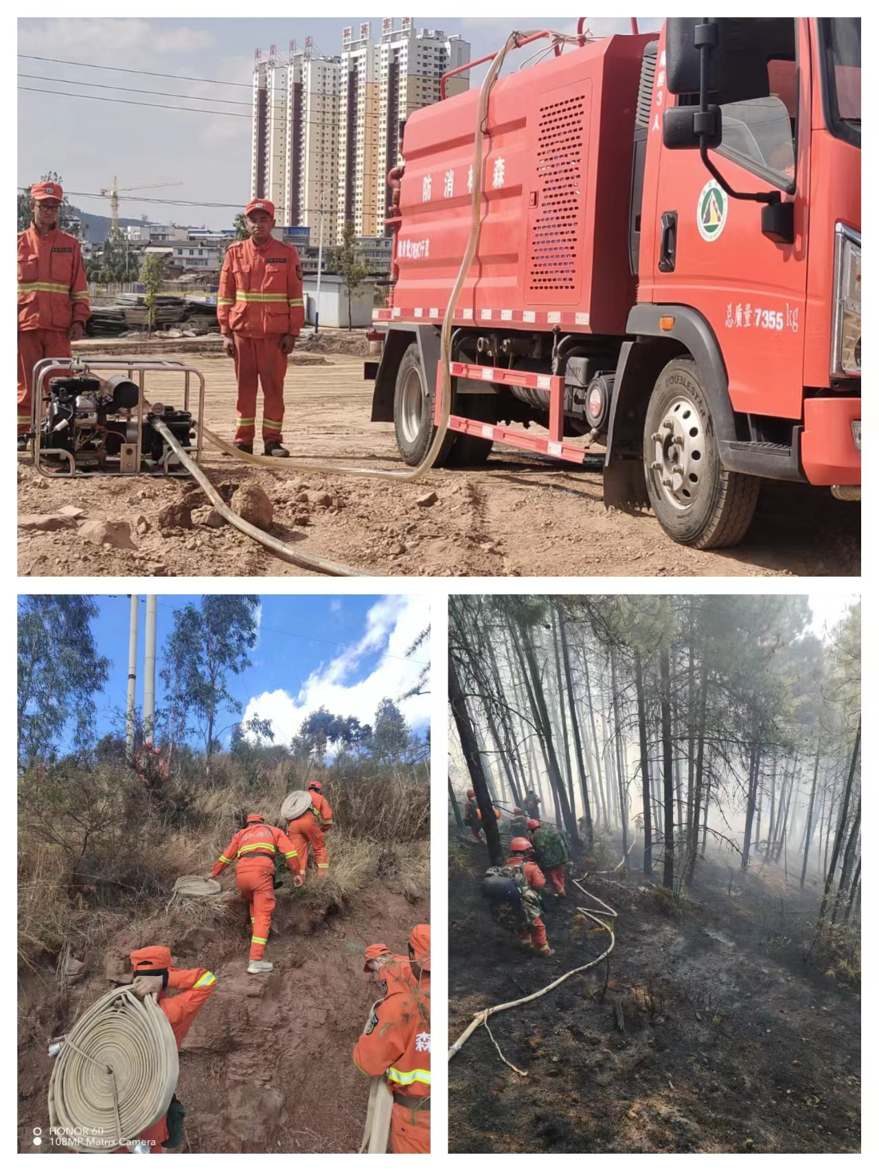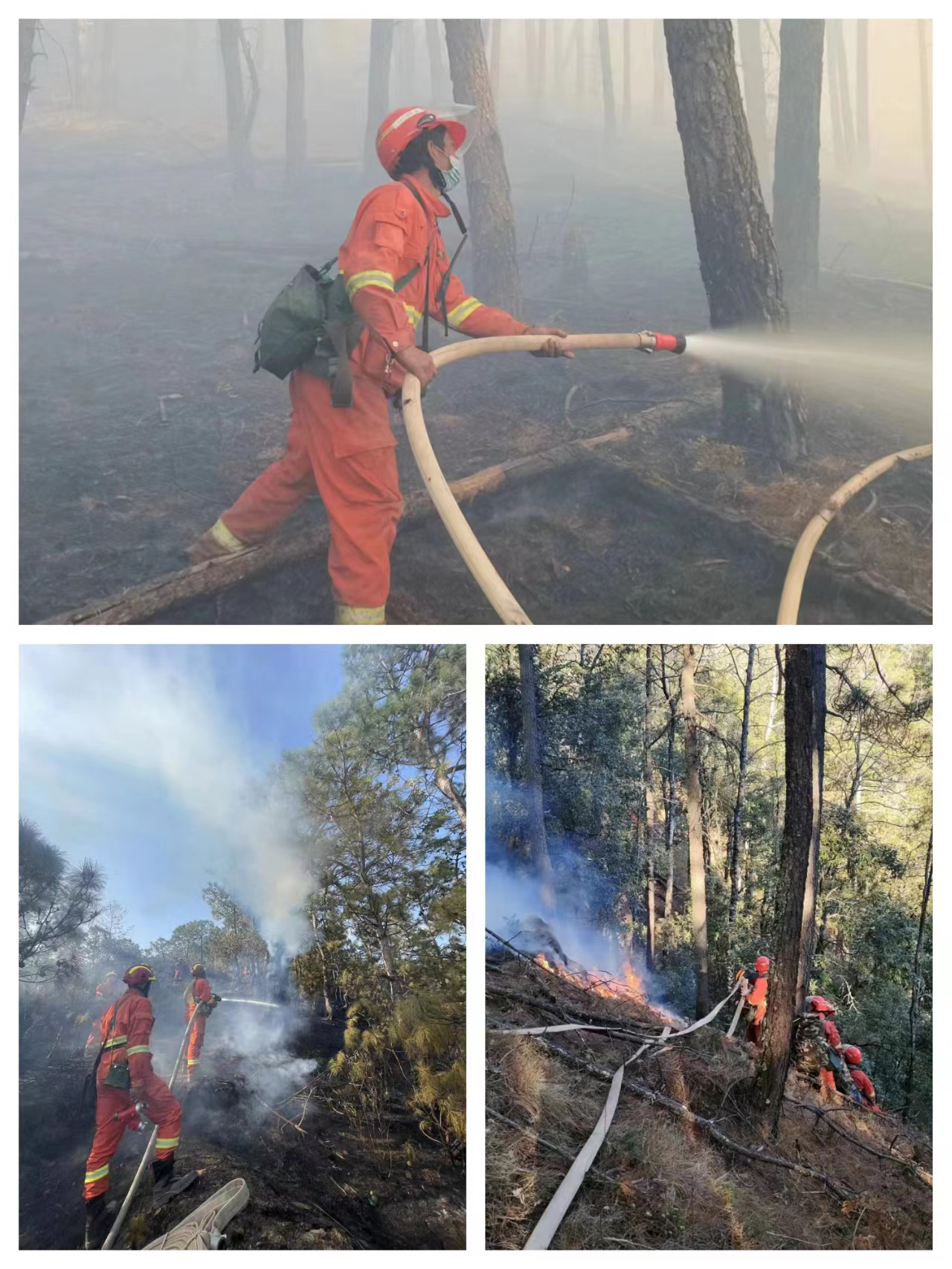 为确保演练成效,勘察选取山林复杂地形区域,模拟实战进行演练。演练严格按照森林火灾应急处置流程,在发现“火情”后,队伍紧急集结,第一时间到达火场,指挥员通过分析研判火势,迅速制定扑救方案、下达扑火指令,队伍果断出击,架水泵、铺水带、接枪头,采取“以水灭火”方式从多个方向对火头进行压制、扑打,较短时间全面控制住了“火势”。