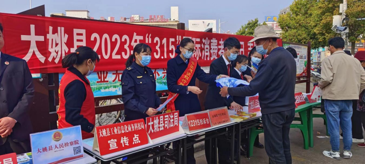 为进一步扩大消费者维权知识的宣传力度,3月15日上午,大姚县司法局积极参与了由县市场监督管理局筹办的大姚县2023年“3•15国际消费者权益日”主题宣传志愿服务活动。县委宣传部、县委政法委、县委网信办等12家部门参加了此次户外宣传活动。