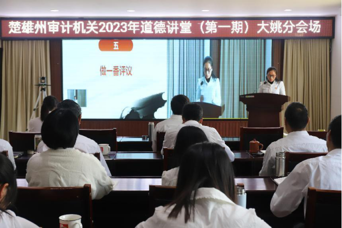 3月24日下午,楚雄州审计局开展以“爱党爱国”为核心的2023年第一期道德讲堂活动,大姚县审计局作为协办单位参与活动,大姚县审计局全体干部职工共28人参加。活动以“唱一首歌、讲一个故事、诵一段经典、做一番评议”的形式开展。