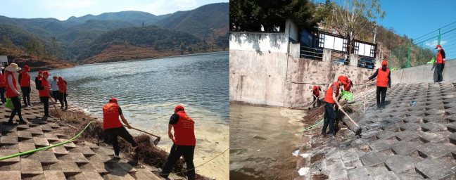 种树完成后,大家又开始积极清理水库坝体周边杂草,水面水草。大家分工明确、相互协作,发扬不怕脏不怕累的服务精神,一起将水库沿岸及水面的白色垃圾、断树枝、杂草等一一清除干净。