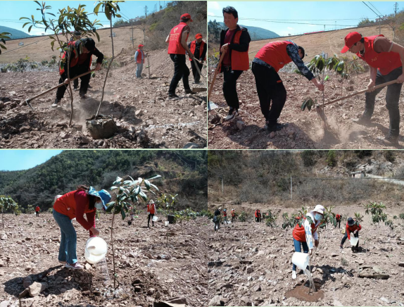 在植树现场,大家顶着天气的炎热,积极投入劳动,有的挥镐栽树,有的运苗固苗,有的施肥浇水,分工协作,干的热火朝天。经过努力,共栽下枇杷树幼苗200多株。