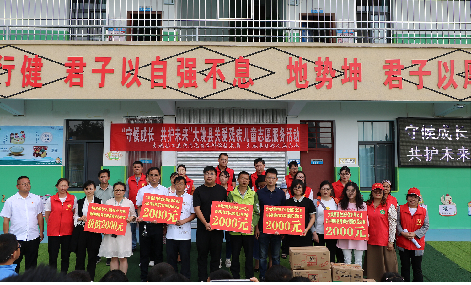 5月11日县残联、县工信局组织爱心企业、爱心人士组成帮扶慰问残疾儿童志愿者队伍,到县特殊教育学校开展“守候成长 共护未来”关爱残疾儿童志愿服务活动,看望慰问和陪伴在校残疾儿童。活动邀请云南纳喜文化创意开发有限公司残疾绣娘赵开芹讲授励志故事,云南大姚祥华工业制造股份公司、中国移动大姚分公司5家企业分别向县特殊教育学校捐赠了各2000元合计10000元的慰问金及爱心物资。