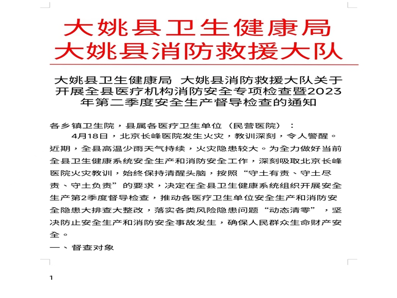 一是强化动员部署,提升部门“行动指数”。“4.18”火灾事故发生后,大队第一时间与县卫健部门沟通协调,科学分析当前全县的消防安全形势,结合“五一”假期的特点,县消防安全委员会办公室下发《关于加强“五一”期间火灾风险预警提示函》;联合县卫健局共同印发了《关于开展全县医疗机构消防安全专项检查暨2023年第二季度安全生产督导检查的通知》,对全县医疗机构消防安全大排查大整治工作进行了全面部署,全力保障医疗机构消防安全。