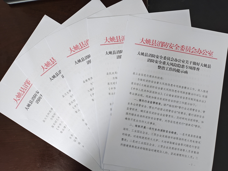 近日,为进一步推动消防安全重大风险隐患专项排查整治2023行动,大姚县消防救援大队向重点行业部门下发了消防安全重大风险隐患专项排查整治工作提示函,提示行业部门切实加强火灾防控工作,落实本行业系统消防安全监管责任,严防各类火灾事故。