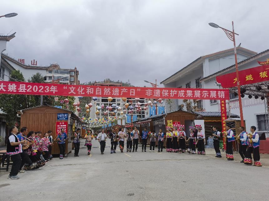 为进一步增强文化认同、坚定文化自信,提高广大群众对非物质文化遗产保护意识,全面展示大姚县非物质文化遗产创新发展工作成果,以“加强非遗系统性保护 促进可持续发展”为主题的大姚县2023年“文化和自然遗产日”系列活动,于6月12日至13日在大姚县核桃文化产业园广场举行。