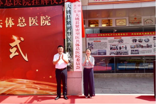 县委副书记、县长杨军和州卫健委副主任李静媛为“中国共产党大姚县紧密型医共体总医院委员会”“大姚县紧密型医共体总医院”揭牌。