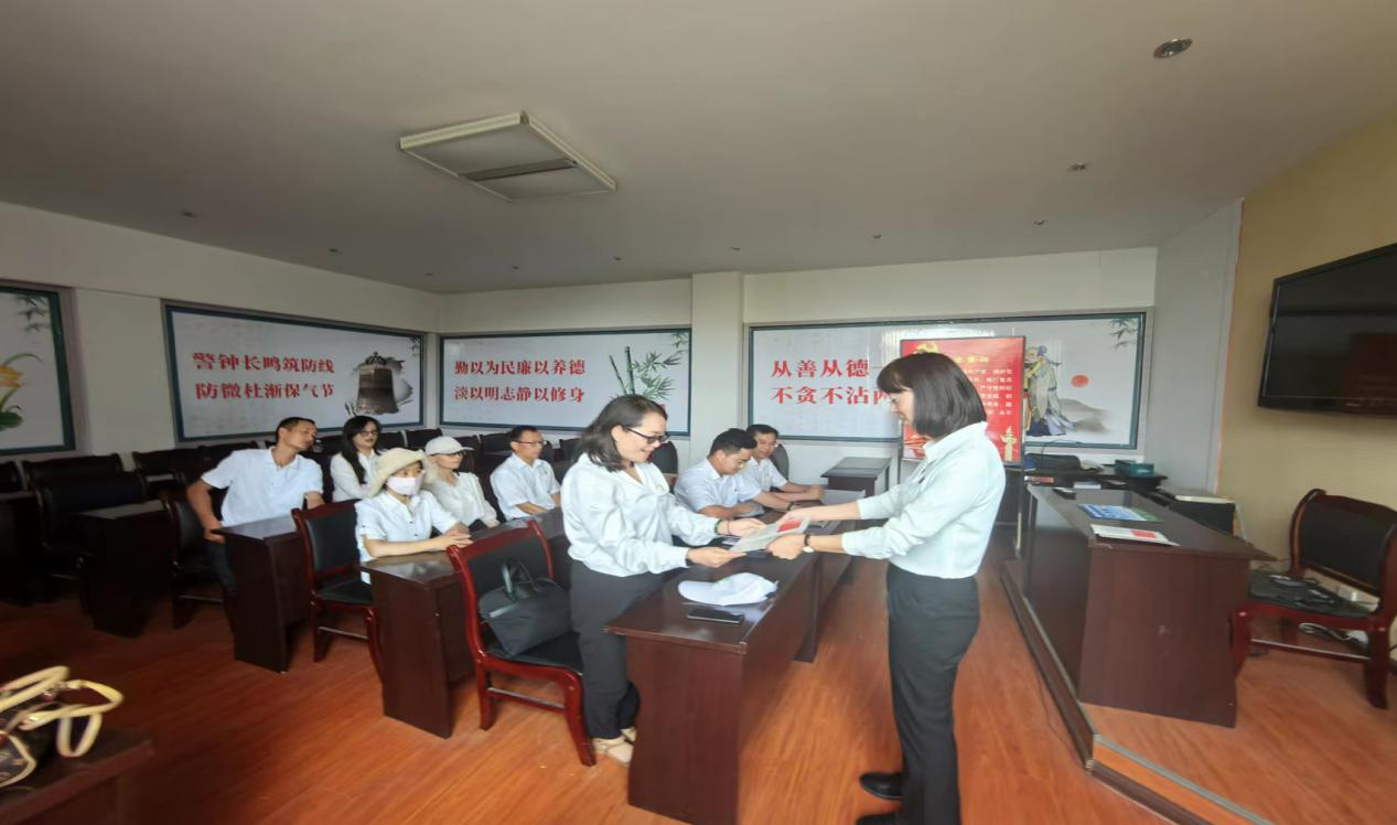 最后,在“报告厅”,组织全体党员干部观看了警示教育片《巡“剑”破“风”》第一集《花样“吃喝”》;支部书记蔡荣婕同志领大家重温入党誓词,重忆入党初心,接受党史党性教育,点燃奋斗激情,全体党员学唱中国共产党入党誓词歌《我宣誓》;并为7月入党的殷正萍、马劲松、周红3位同志过“政治生日”。