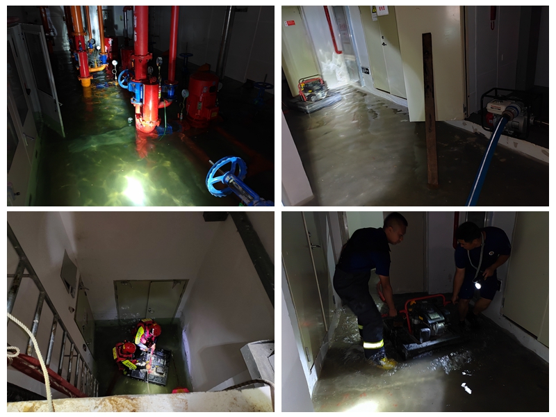 到场后,指战员在报警人指引来到地下室,经侦察,地下室现已形成严重积水,最深处约1.3米,询问知情人得知,可能是消防水泵房设备故障导致。地下室有发电机房、配电室、消防泵房三个库室,涉水面积近110平米。经估算,整个地下室积水近150立方米。
