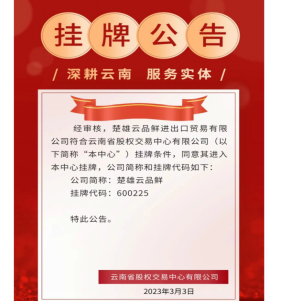 我县按照“储备一批、培育一批、辅导一批、上市一批”的工作路径,坚持“企业主动、政府推动、市场拉动、中介联动”的工作方式,通过建立现代企业管理制度,从不同板块培育和推动企业上市,打造出具有我县特色、品质优良、竞争力强的资本市场。2022年我县云南大姚祥华工业制造股份公司实现了在云南省股权交易中心挂牌零突破,2023年再添佳绩,新增楚雄云品鲜进出口贸易有限公司、大姚广益发展有限公司、大姚华盛饮料食品有限责任公司3户企业在云南省股权交易中心挂牌。