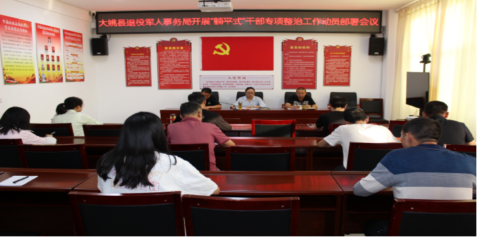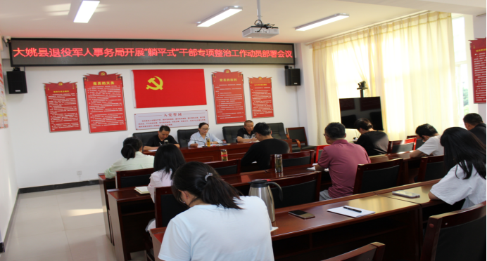 2023年8月4日上午大姚县退役军人事务局召开“躺平式”干部专项整治动员部署会议,局领导班子成员、全体干部职工参加会议。