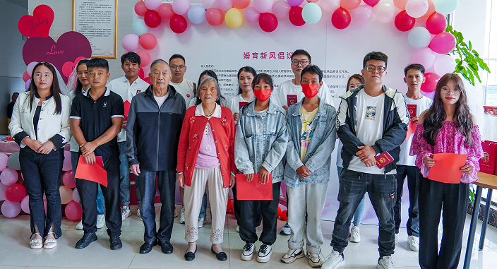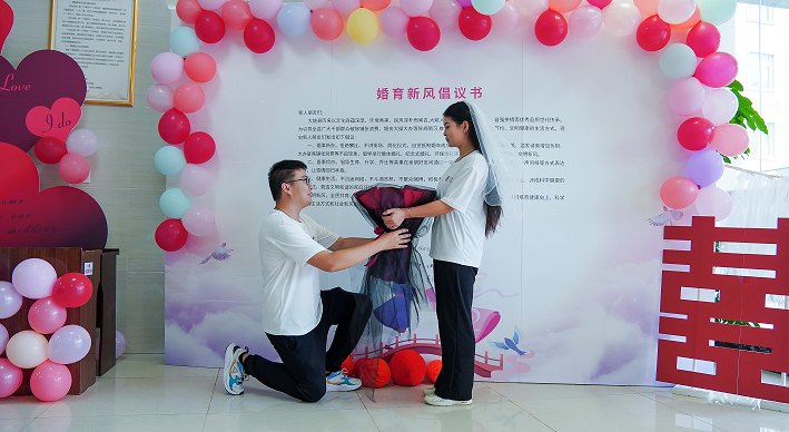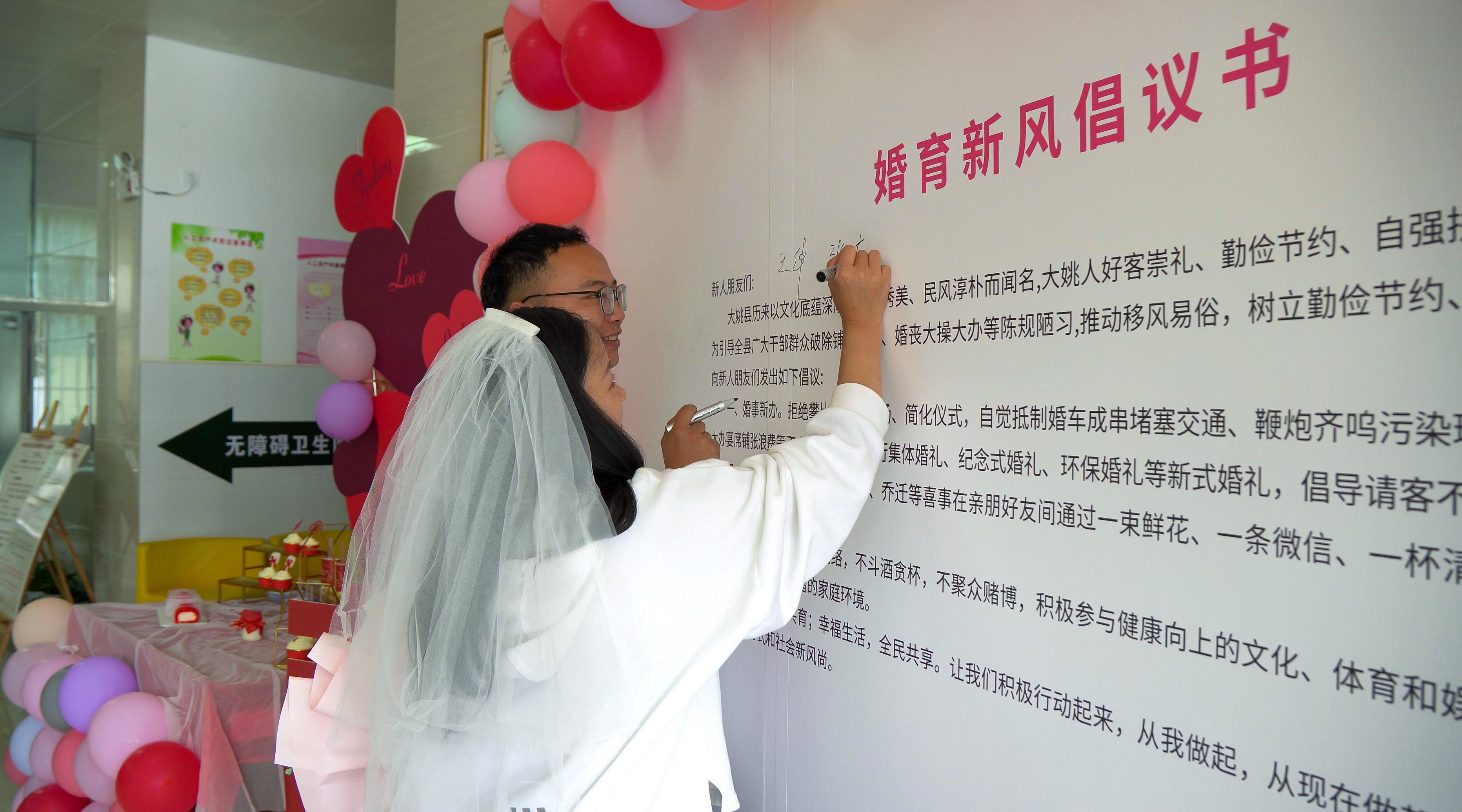 牲酒赛秋社,箫鼓迎新婚。自古以来,婚礼承载着人们对婚姻家庭的美好希冀。新人在纳采、请期、亲迎等一道道仪式仪礼中缔结白首之约。但是,这些原本用以传递美好情谊的婚姻礼俗,在一些地方却“走了样”“变了味”。有的地方在婚俗领域存在大操大办、高价彩礼等不良婚俗。为倡导婚育新风尚,活动现场设置了《婚育新风倡议书》签字墙,新人们在《倡议书》上郑重的签上自己姓名,纷纷响应积极践行文明婚俗、节俭婚俗理念的倡议。