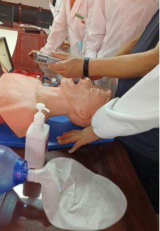培训结束后,参训人员亲自动手操作演练,三位老师逐一悉心指导、纠正错误操作,通过示范-操作-再示范的方式,参训医务人员更进一步掌握了气管插管及护理、简易呼吸囊的使用知识。此外,送教老师还耐心解答了在日常处置急危重症患者中的疑难问题。