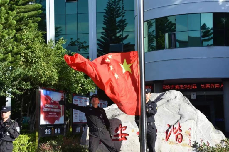 “升国旗,奏国歌,敬礼!”鲜艳的五星红旗在国歌声中冉冉升起,迎风飘扬。参加升旗仪式的全体民辅警列队向国旗敬礼,面向国旗深切表达了对祖国的崇高敬意,展现了浓厚的爱国情怀。