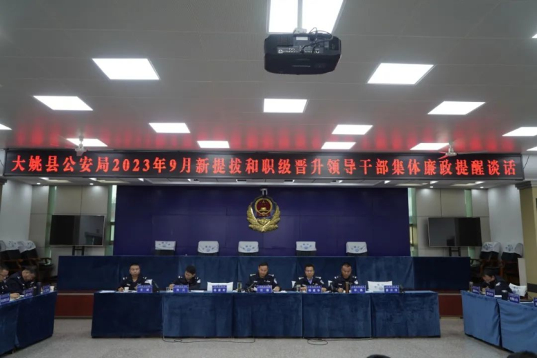 为了进一步增强新任职领导干部和新晋升职级民警廉洁自律和履职能力,强化队伍建设,10月9日下午,大姚县公安局召开新晋职务、职级民警廉政座谈会,县人民政府副县长、县公安局党委书记、局长汪福主持并开展集体廉政谈话。局党委班子成员,局机关及14个派出所实职副科以上领导干部,县局纪委、考核办、特警大队、网安大队、出入境管理大队负责人,2023年9月新晋升职务职级民警参加会议。