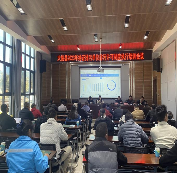 为进一步督促排污单位落实排污许可主体责任,提高大姚县辖区内排污许可证持证单位管理业务水平,规范排污许可证后管理填报,2023年12月18日,楚雄州生态环境局大姚分局举办2023年度排污许可制度执行培训班,辖区内41家持证排污单位负责人和环保专职人员参加培训。