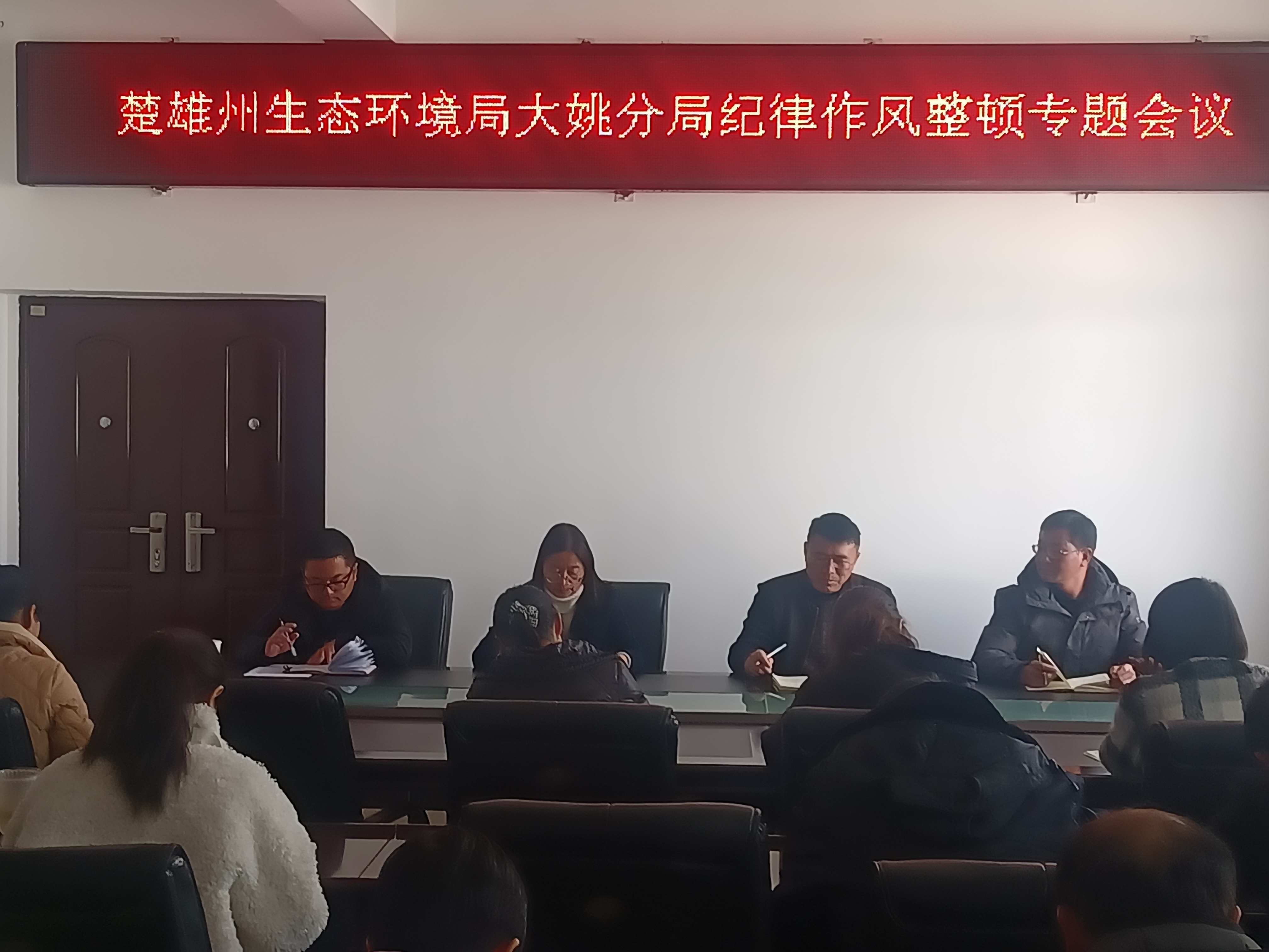 会议要求:作风建设永远在路上,党组及党政班子成员要严格履行管党治党主体责任和“一岗双责”责任,一是要以学习贯彻新修订的纪律处分条例为契机加强纪律教育,认真开展党纪党规学习教育,着力解决对党纪党规不上心、不了解、不掌握和执行不到位等问题。二是要以规范运用“四种形态”为导向严格纪律执行,以压紧压实政治责任为抓手凝聚管党治党合力,健全各负其责、统一协调的责任格局。三是要重拳纠治干部群众反映强烈的形式主义、官僚主义,从领导干部抓起、改起,坚决纠治影响各级党委政府决策部署落实落地、影响高质量发展、加重基层负担、损害群众利益、权力观扭曲政绩观错位等问题。全体党员干部职工一是要深入理解和把握新时代赋予生态环境保护工作的新使命、新要求,切实提高政治站位,深刻领悟“两个确立”的决定性意义,自觉增强“四个意识”、坚定“四个自信”、做到“两个维护”,做遵规守纪、怀德自重、修身律己的表率;二是要牢固打铁还需自身硬的理念,严格遵守“十严禁”要求,不折不扣落实八项规定,时时刻刻做到自我净化、自我革命;三是要守初心、担使命,找差距、抓落实,始终做到政治上不触“红线”,工作上不划“虚线”、生活上不越“底线”,以永远在路上的决心、对党忠诚的信念、务求实效党的行动,推动大姚生态环境保护工作高质量发展。