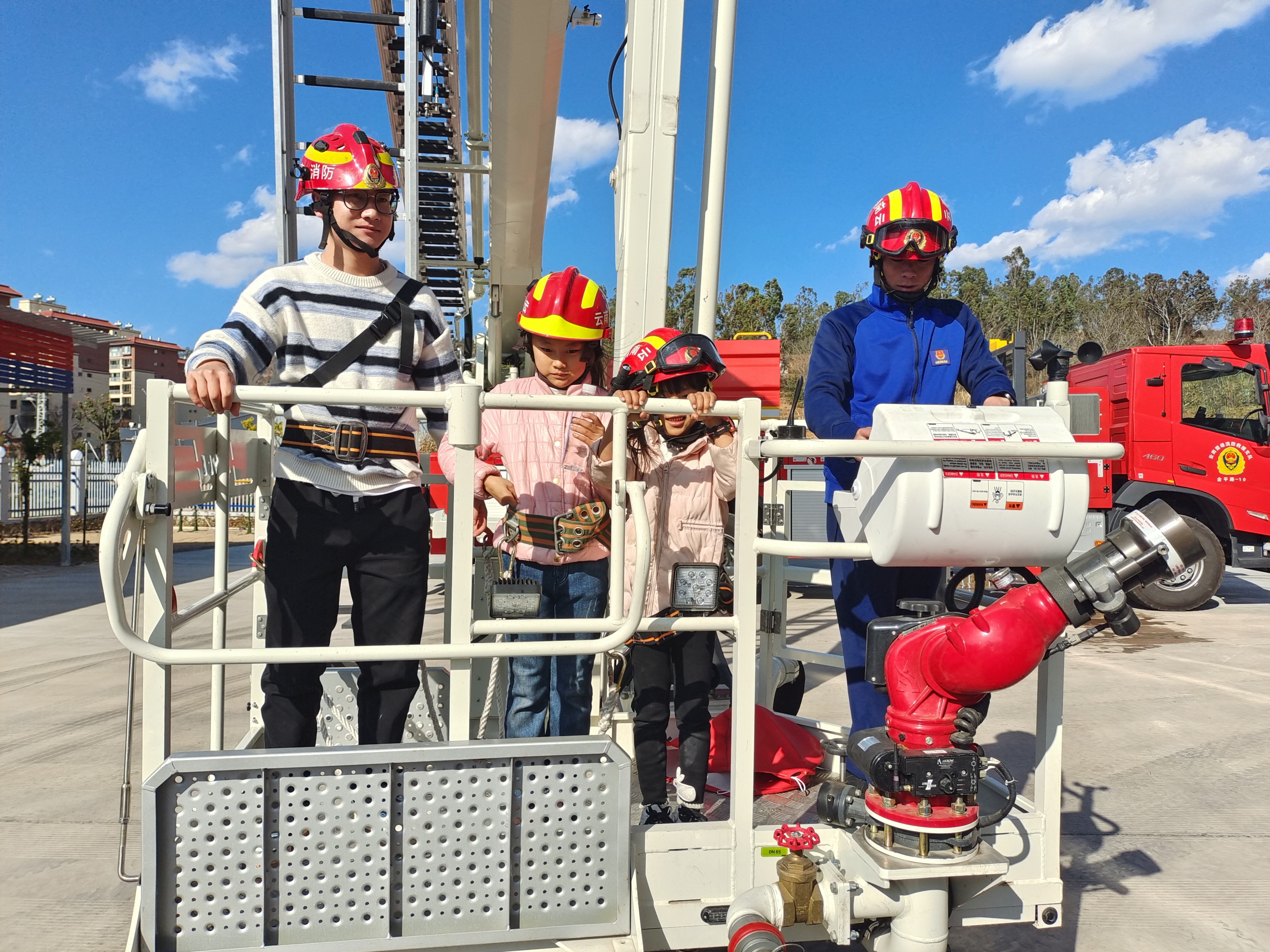 活动中,消防员带领小朋友们参观了消防车,用生动的语言介绍各种消防车辆和装备器材的战斗性能。面对液压剪、防毒面具、水带等器材装备,孩子们好奇地不断提出问题,消防员耐心讲解,通过讲解与示范相结合的形式,向孩子们展示了用各种消防器材及装备的使用方法,并帮助孩子们穿上消防服,当一次“小小消防员”,切实过一把“消防瘾”。