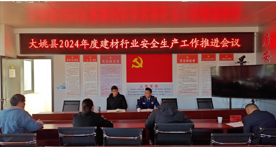为认真贯彻落实党中央、国务院和省委、省人民政府,州委、州人民政府对近期生产安全事故作出的重要指示批示精神,扎实做好全县安全生产工作,坚持“人民至上、生命至上”,坚决扛牢压实安全生产工作政治责任,2024年1月30日,大姚县召开2024年度建材行业安全生产工作推进会议。会议由县安委办主任杨仓生同志主持,县工业信息化商务科技局、县消防救援大队、县供电局、县住房和城乡建设局相关领导参加会议。会议通报了近期全国各地安全生产事故,总结了建材行业专项整治以来,将城区划分为五个责任区由各单位挂包开展工作所取得的成果,并就下一步工作作安排部署。
