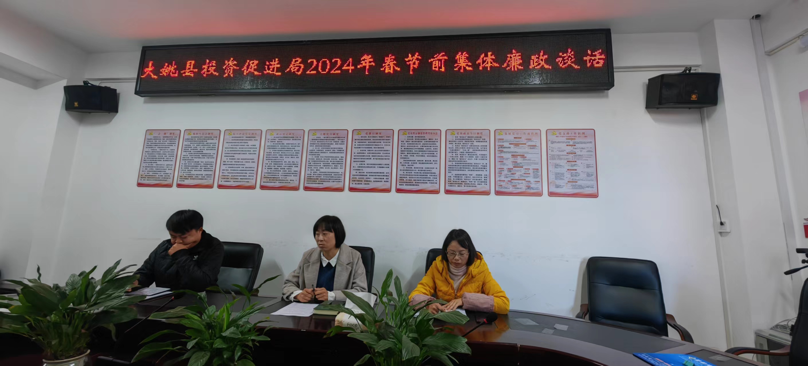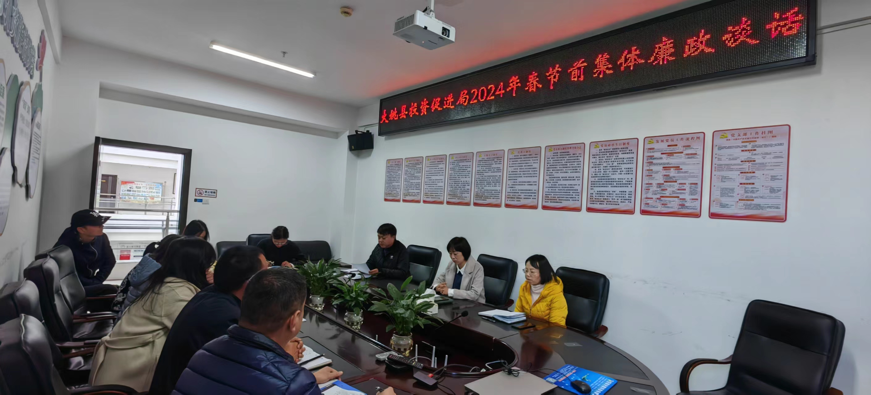 为进一步落实全面从严治党主体责任,筑牢干部职工廉洁自律思想防线,坚持“教育在先、警示在先、预防在先”的原则。1月31日,县投资促进局召开2024春节前集体廉政谈话,党组书记、局长蔡荣婕对全体干部职工进行节前谈话提醒。