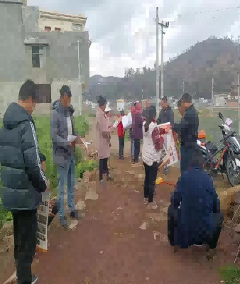 图为:村干部到田间地头宣传,发宣传画
