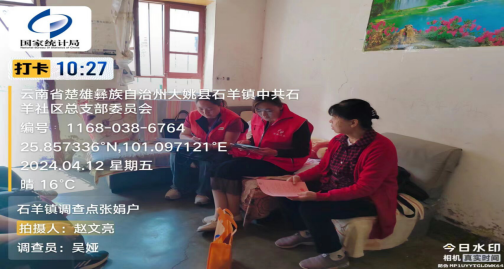 为更加精准地掌握我县劳动力调查的动态情况,2024年4月12日大姚县统计局劳动力调查专业人员,深入到石羊镇石羊社区调查点开展入户陪访工作。