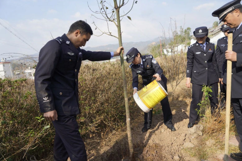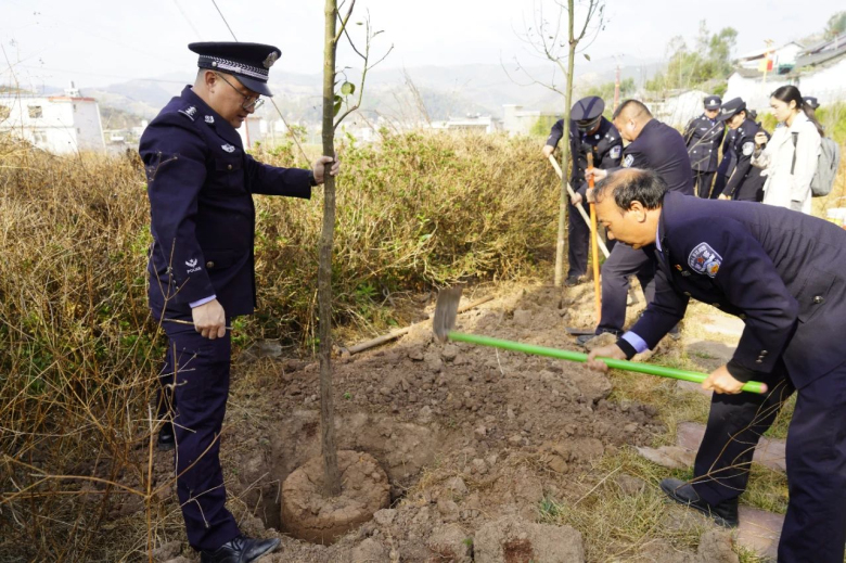 “栽下一片绿意,传承红色基因”。4月3日上午,在清明节即将来临之际,大姚县公安局机关第一党支部、机关第二党支部、派出所第二党支部32名民警、辅警,到七街赵祚传革命烈士陵园开展“清明祭英烈、植树寄哀思”主题党日活动,将香樟树种植在烈士陵园前的空地,以植树的方式表达对革命先烈的无限崇敬和深切缅怀。