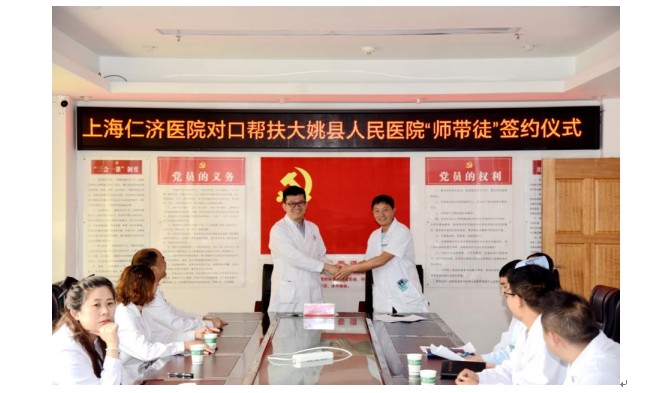 4月8日,大姚县医共体总医院(县人民医院)举行上海交通大学医学院附属仁济医院对口支援帮扶师带徒启动签字仪式,5位上海仁济医院业务精、素质强、有责任感的专家岳江、袁凯、马晓晓、韩婷、江海燕正式与县人民医院7位优秀青年医护人员确定了师徒关系。进行拜师学习,跟师指导,开展临床实践工作。此举是医院把握发展契机,拓宽发展空间,通过“师带徒”对接高端拜师传承的良机,是培养造就一支适应医院发展需要、结构合理、素质良好的人才队伍的重大举措。