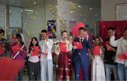 “我们自愿结为夫妻,从今天开始,我们将共同肩负起婚姻赋予我们的责任和义务:上孝父母,下教子女,互敬互爱,互信互勉,互谅互让,相濡以沫,同甘共苦,成为终生的伴侣!我们要坚守今天的誓言,我们一定能够坚守今天的誓言!”新人们在工作人员带领下齐声宣读《结婚誓言》。