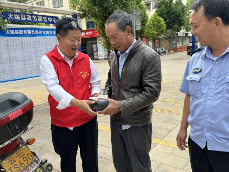 5月21日上午,大姚县政务服务中心志愿者在开展吸烟劝导及业务导办的过程中,无意间发现吸烟区旁停放的摩托车后座上有一个被打开的钱包,他环顾四周并没有看见摩托车主,估计是前来大厅办事的群众在拿证件后,慌忙中忘记了收整钱包就急于办事。志愿者担心失主找不到东西会着急,便叫上一起值班的安保人员查看了钱包,当看到钱包内有失主的身份证、驾驶证及大量现金时,一边在摩托车旁等候失主,一边通知一楼值班咨询台在大厅显示屏上打出失物招领通告。20分钟后失主急急忙忙赶来,志愿者待核实信息后将钱包归还失主。经了解,原来是家住龙街镇的毛大伯前来政务大厅交警窗口更换摩托车驾驶证,因为着急不慎将钱包落在车上,事后发现时才急忙前来寻找。