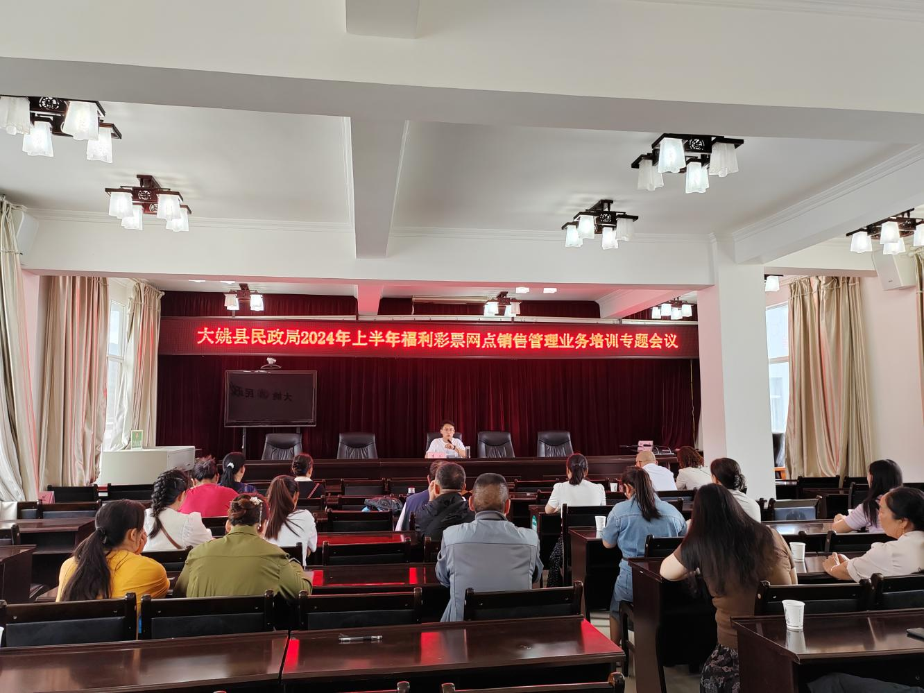 6月14日下午3:30大姚县民政局组织县属27家福彩销售网点业主、销售人员召开2024年上半年福利彩票网点销售管理业务专题培训会议,全县27家福彩销售网点业主和福利彩票销售人员均按相关要求参加会议。