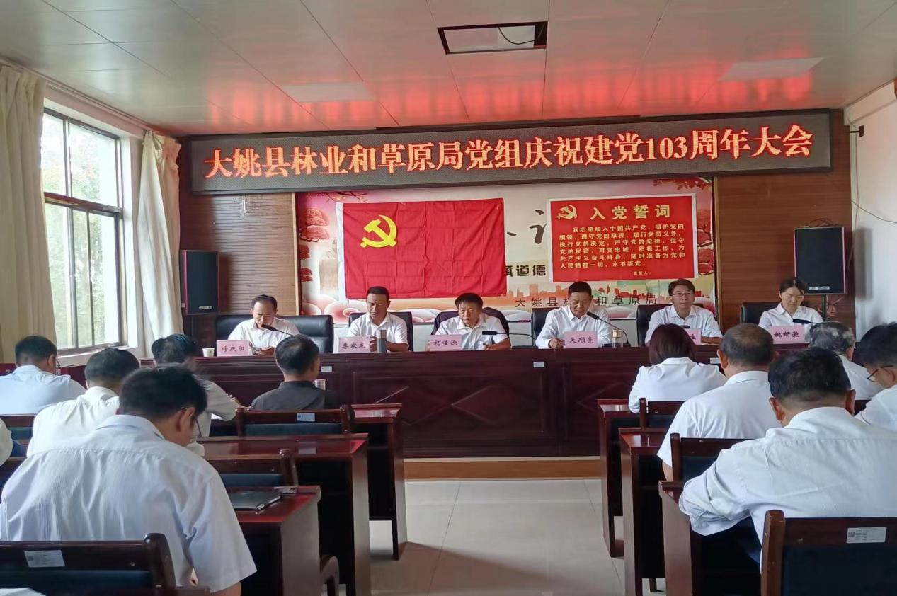 为庆祝中国共产党成立103周年,推动党纪学习教育走深走实,中共大姚县林业和草原局党组于2024年6月27日在林火监测中心组织开展“守红色初心担绿色使命”暨庆祝中国共产党成立103周年活动。