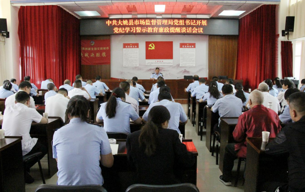 2024年7月1日,中共大姚县市场监督管理局党组召开党纪学习教育警示教育会,全局党员干部职工和小个专全体党员到大姚县新时代廉洁文化中心开展“沉浸式”纪法教育,观看警示教育片《政“疾”之祸》,局党组书记、局长施汝宏为全体参会人员讲授廉政纪律党课并开展集体廉政提醒谈话。