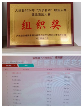 云南省第九届“万步有约”职业人群健走激励大赛大姚赛区于近日落下帷幕,大姚县政务服务局组队“Z原动力梦之队W”在全县29支参赛队伍中脱颖而出,10名队员从(1949年中华人民共和国成立)起步,历时100天历经17个赛段,5人顺利到达2024年(中华人民共和国成立75周年)终点,全队荣获大姚赛区第六名的好成绩,单位被“大姚县创建国家慢性病综合防控示范区工作领导小组”授予大姚县2024年“万步有约”职业人群健走激励大赛“组织奖”荣誉。
