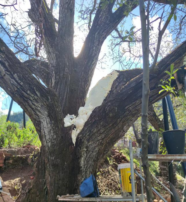 一级核桃古树位于大姚县三台乡三台社区松子园小组,是当地最大的1株核桃古树,树龄约为1006年。由于树龄长,古树冠幅过大,主分支受外力及自身重力影响等原因,核桃古树出现了树势弱,植物组织老化,树木生长活力变差等诸多问题。根据前期详细的调查情况,县林草局对核桃古树采取了树洞修补及树体防腐、枯枝修剪及杂物清理、支撑加固、修建古树简介保护牌、修建树池及保护围栏、搭建树木监控设备、建设太阳能杀虫灯等一系列科学的抢救复壮保护措施,改善了核桃古树的生长环境,提升核桃古树生命力,为衰弱核桃古树撑起“保护伞”,让核桃古树重新焕发新生。